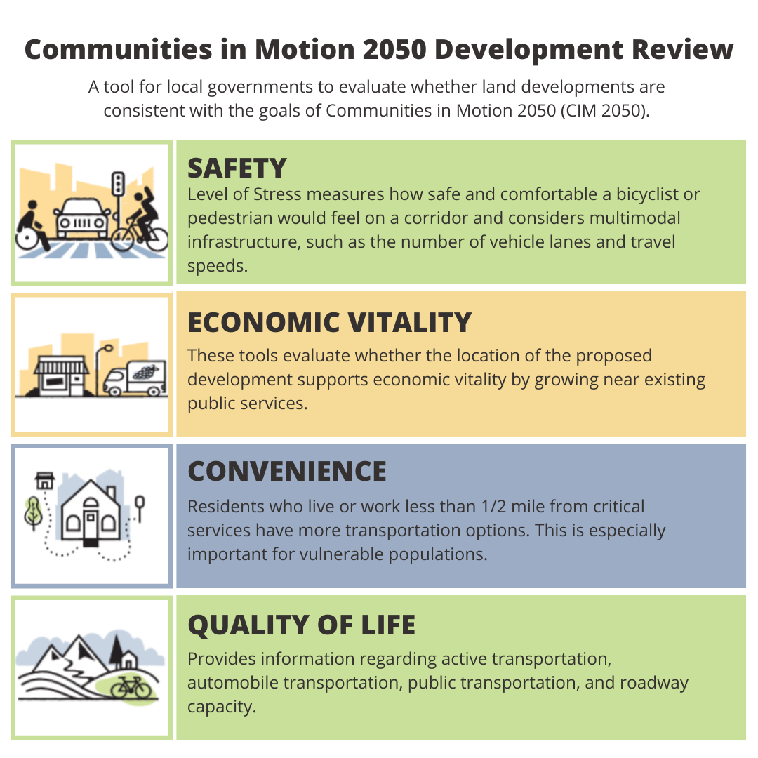 The Community Planning Association of Southwest Idaho (COMPASS) is the metropolitan planning organization (MPO) for Ada and Canyon Counties. COMPASS has developed the development review tool for local governments to evaluate whether land developments are consistent with the goals of Communities in Motion, the regional long-range transportation plan for Ada and Canyon Counties. This checklist is not intended to be prescriptive, but rather a guidance document based on plan goals. Guidelines for determining which developments COMPASS will comment on are identified in the Development Review Policy adopted February 27, 2023. Learn more in the Development Review Checklist user guide.